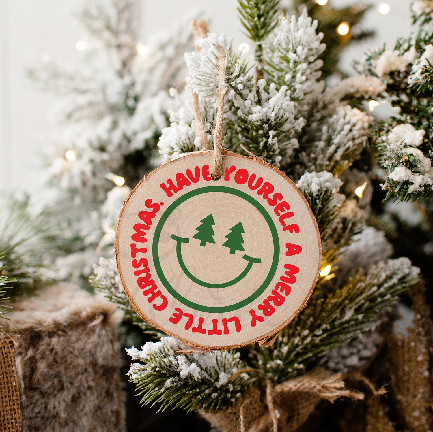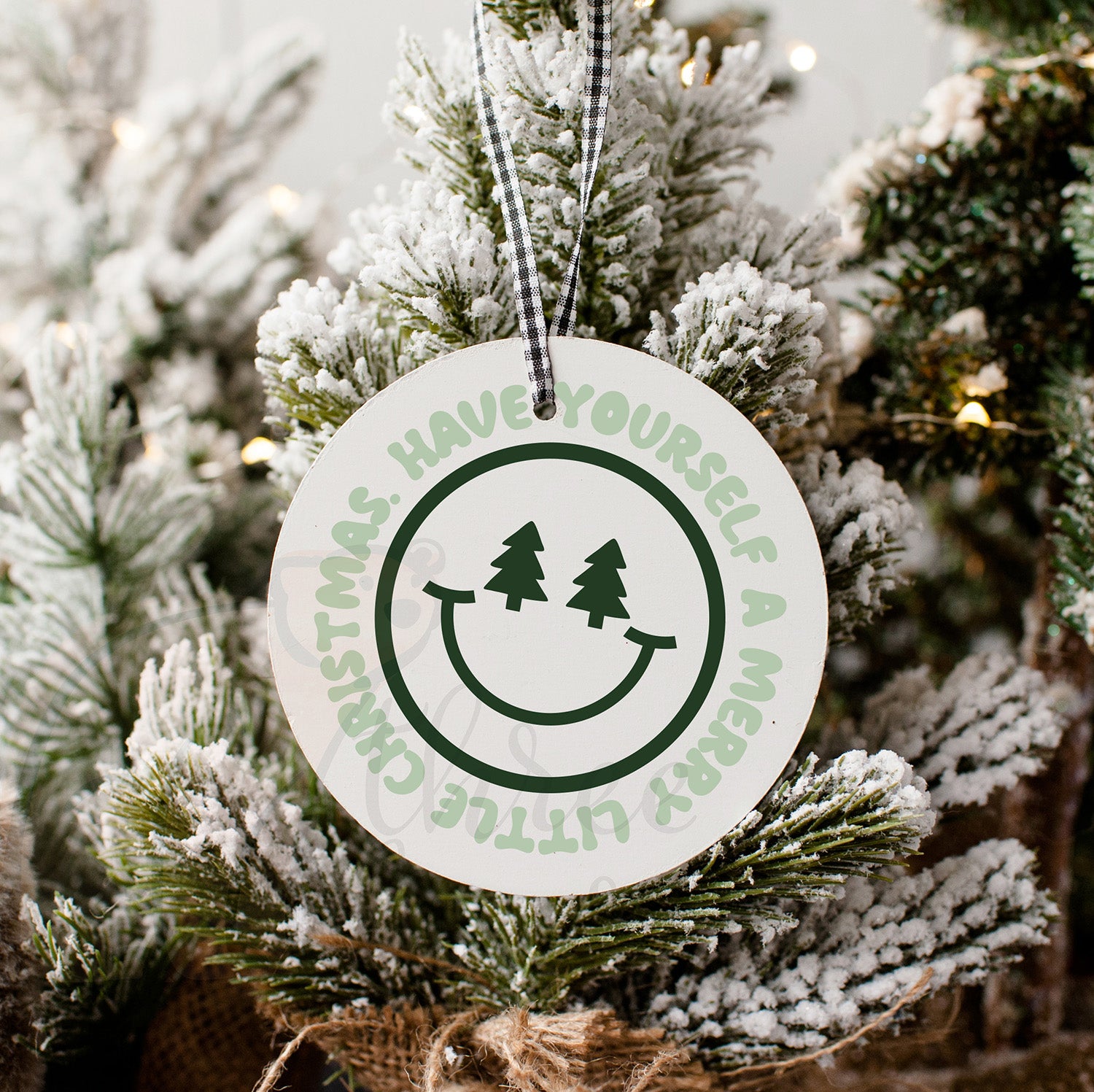Round ornament featuring a a retro smiley face with Christmas trees for eyes surrounded by the phrase "have yourself a merry little Christmas." Choose clear or white acrylic, or wooden round as your base. Ornaments are shipped with a coordinating ribbon hanger. Please choose your ornament base, and then include your vinyl color preferences in the personalization sections. I will do my best to accommodate vinyl color preferences.